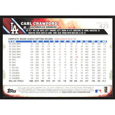 This is a 2016 Topps Carl Crawford baseball card. The card is #423 and pictures show condition.