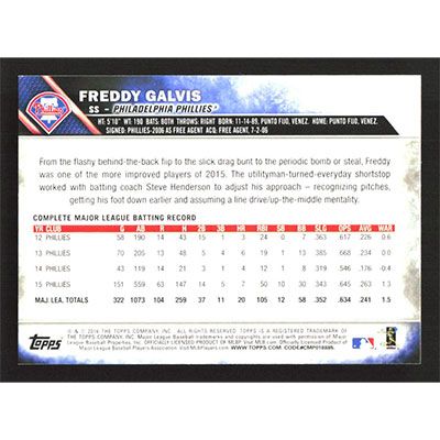 This is a 2016 Topps Freddy Galvis autographed baseball card. This card has been signed, in blue, by Freddy Galvis, and is guaranteed authentic by Ballcardz.com. The card is #461 and pictures show condition.