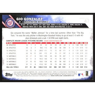 This is a 2016 Topps Gio Gonzalez baseball card. The card is #47 and pictures show condition.