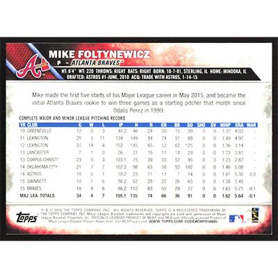 This is a 2016 Topps Mike Foltynewicz autographed baseball card. This card has been signed, in blue, by Mike Foltynewicz, and is guaranteed authentic by Ballcardz.com. The card is #480 and pictures show condition.