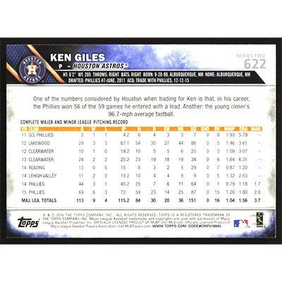 This is a 2016 Topps Ken Giles baseball card. The card is #622 and pictures show condition.