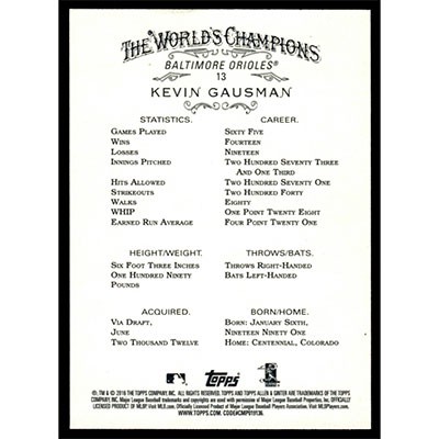 This is a 2016 Topps Allen & Ginter Kevin Gausman baseball card. The card is #13 and pictures show condition.