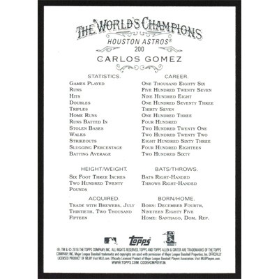 This is a 2016 Topps Allen & Ginter Carlos Gomez baseball card. The card is #200 and pictures show condition.