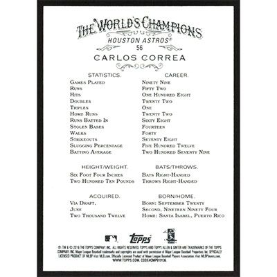This is a 2016 Topps Allen & Ginter Carlos Correa baseball card. The card is #56 and pictures show condition.
