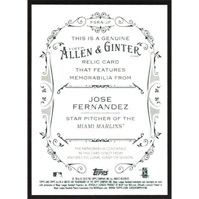 This is a 2016 Topps Allen & Ginter Relics Jose Fernandez Jersey baseball card. The card is #FSRA-JF and pictures show condition.