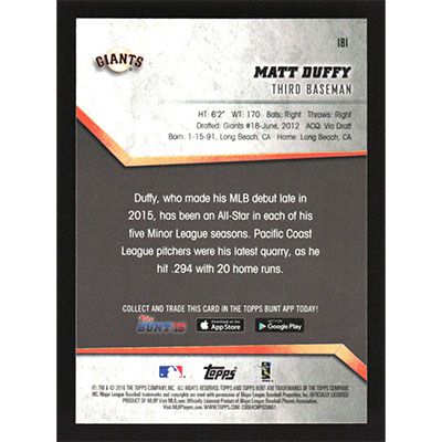 This is a 2016 Topps Bunt Matt Duffy baseball card. The card is #181 and pictures show condition.