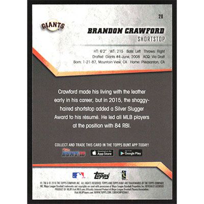 This is a 2016 Topps Bunt Brandon Crawford baseball card. The card is #28 and pictures show condition.