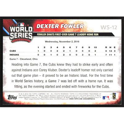 This is a 2016 Topps Chicago Cubs World Series Champions Set Dexter Fowler baseball card. The card is #WS-12 and pictures show condition. Team(s): Chicago Cubs