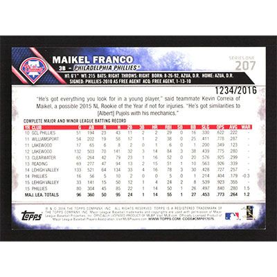 This is a 2016 Topps Gold Maikel Franco Future Stars baseball card. The card is #207 and pictures show condition. This card is limited; #'d 1234/2016. Team(s): Philadelphia Phillies
