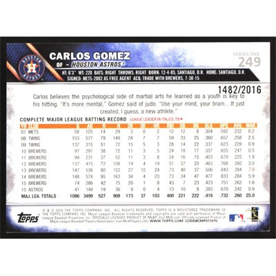 This is a 2016 Topps Gold Carlos Gomez baseball card. The card is #249 and pictures show condition. This card is limited; #'d 1482/2016. Team(s): Houston Astros