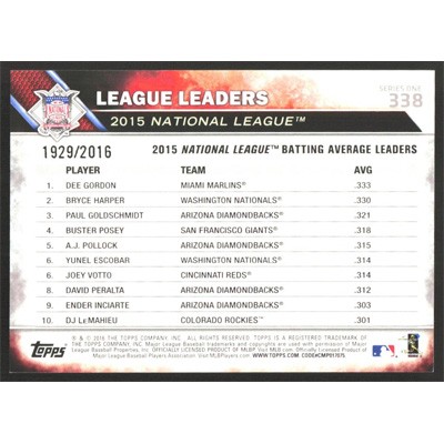 This is a 2016 Topps Gold Dee Gordon, Bryce Harper and Paul Goldschmidt League Leaders baseball card. The card is #338 and pictures show condition. This card is limited; #'d 1929/2016.