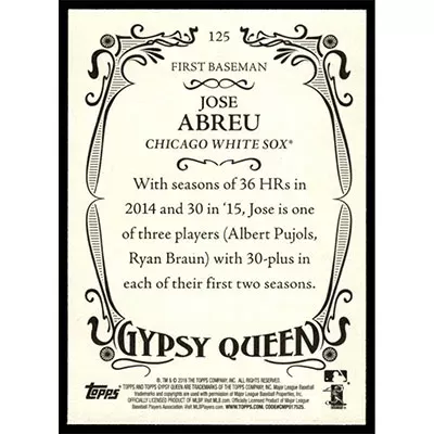 This is a 2016 Topps Gypsy Queen Jose Abreu baseball card. The card is #125 and pictures show condition.