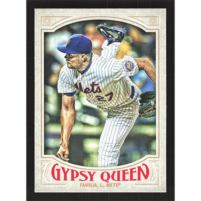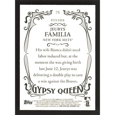 This is a 2016 Topps Gypsy Queen Jeurys Familia baseball card. The card is #75 and pictures show condition.