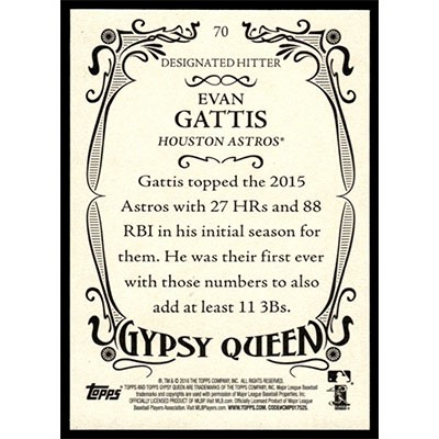 This is a 2016 Topps Gypsy Queen Framed Blue Evan Gattis baseball card. The card is #70 and pictures show condition.
