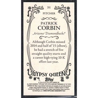 This is a 2016 Topps Gypsy Queen Mini Patrick Corbin baseball card. The card is #281 and pictures show condition.