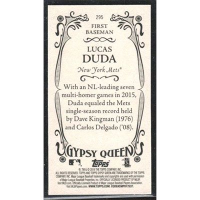 This is a 2016 Topps Gypsy Queen Mini Lucas Duda baseball card. The card is #295 and pictures show condition.