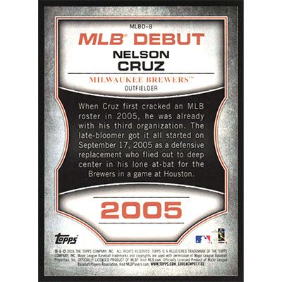 This is a 2016 Topps MLB Debut Bronze Nelson Cruz baseball card. The card is #MLBD-8 and pictures show condition.