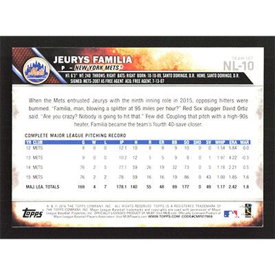 This is a 2016 Topps National League All-Stars Jeurys Familia baseball card. The card is #NL-10 and pictures show condition.