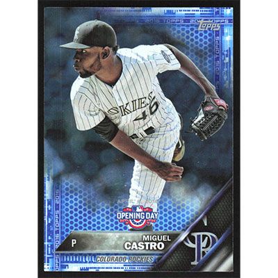 This is a 2016 Topps Opening Day Blue Foil Miguel Castro baseball card. The card is #OD-173 and pictures show condition.