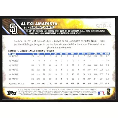 This is a 2016 Topps Padres Team Set Alexi Amarista baseball card. The card is #SDP-5 and pictures show condition.