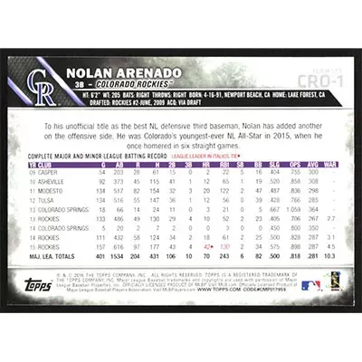 This is a 2016 Topps Rockies Nolan Arenado baseball card. The card is #CRO-1 and pictures show condition.