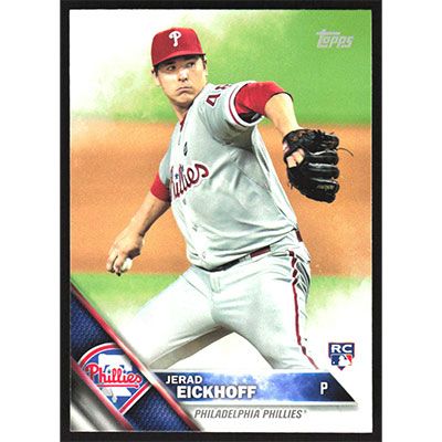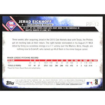 This is a 2016 Topps Team Sets Jerad Eickhoff baseball card. The card is #PP-12 and pictures show condition. Team(s): Philadelphia Phillies Rookie Card (RC)