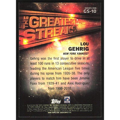 This is a 2016 Topps The Greatest Streaks Lou Gehrig baseball card. The card is #GS-10 and pictures show condition.