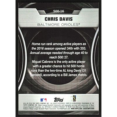 This is a 2016 Topps Update 500 HR Futures Club Chris Davis baseball card. The card is #500-16 and pictures show condition.