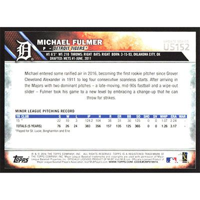 This is a 2016 Topps Update Michael Fulmer baseball card. The card is #US152 and pictures show condition.