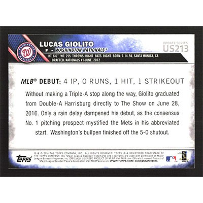 This is a 2016 Topps Update Lucas Giolito Rookie Debut baseball card. The card is #US213 and pictures show condition. Team(s): Washington Nationals Rookie Card (RC)