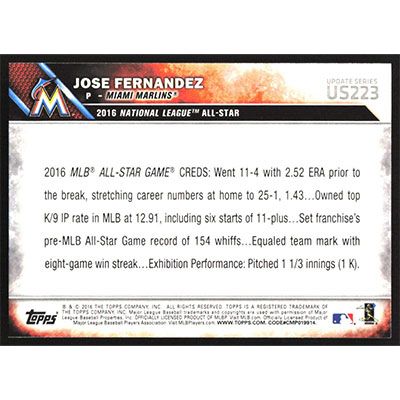 This is a 2016 Topps Update Jose Fernandez All-Star baseball card. The card is #US223 and pictures show condition.