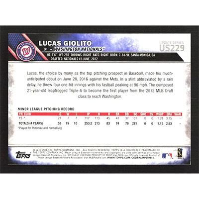 This is a 2016 Topps Update Lucas Giolito baseball card. The card is #US229 and pictures show condition. Team(s): Washington Nationals Rookie Card (RC)