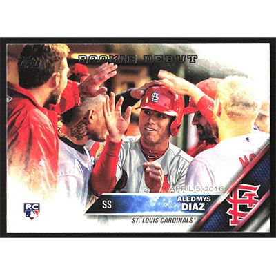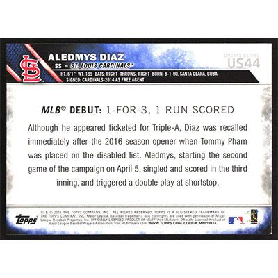 This is a 2016 Topps Update Aledmys Diaz Rookie Debut baseball card. The card is #US44 and pictures show condition. Team(s): St. Louis Cardinals Rookie Card (RC)
