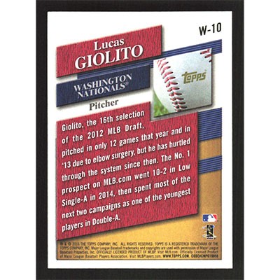 This is a 2016 Topps Update Wal-Mart Exclusive Rookies Lucas Giolito baseball card. The card is #W-10 and pictures show condition. Team(s): Washington Nationals Rookie Card (RC)