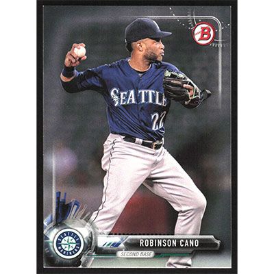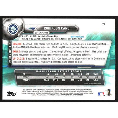 This is a 2017 Bowman Robinson Cano baseball card. The card is #74 and pictures show condition.