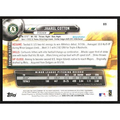 This is a 2017 Bowman Jharel Cotton baseball card. The card is #89 and pictures show condition.