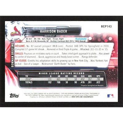 This is a 2017 Bowman Chrome Prospects Harrison Bader autographed baseball card. This card has been signed, in blue, by Harrison Bader, and is guaranteed authentic by Ballcardz.com. The card is #BCP143 and pictures show condition.