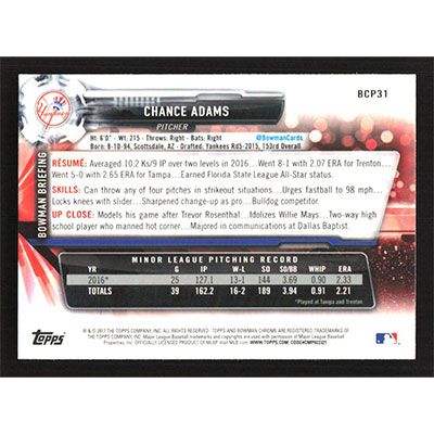 This is a 2017 Bowman Chrome Prospects Chance Adams autographed baseball card. This card has been signed, in blue, by Chance Adams, and is guaranteed authentic by Ballcardz.com. The card is #BCP31 and pictures show condition.