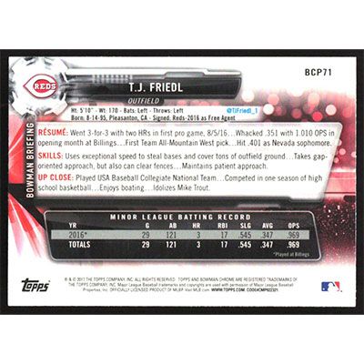 This is a 2017 Bowman Chrome Prospects T.J. Friedl baseball card. The card is #BCP71 and pictures show condition.
