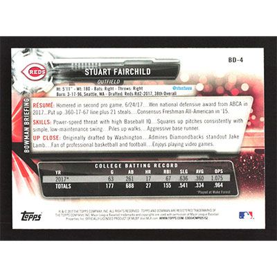 This is a 2017 Bowman Draft Stuart Fairchild baseball card. The card is #BD-4 and pictures show condition.