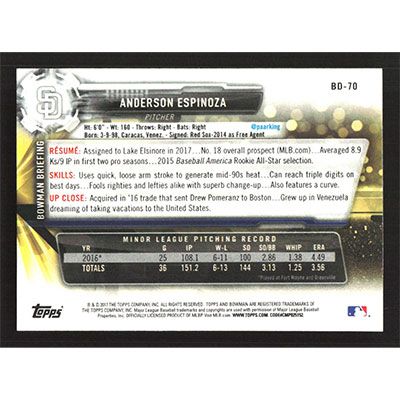 This is a 2017 Bowman Draft Anderson Espinoza baseball card. The card is #BD-70 and pictures show condition.