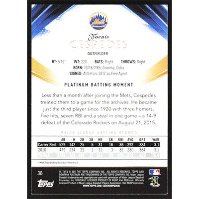 This is a 2017 Bowman Platinum Yoenis Cespedes baseball card. The card is #38 and pictures show condition.
