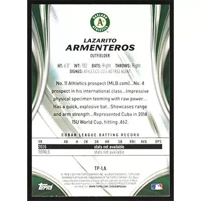 This is a 2017 Bowman Platinum Top Prospects Lazarito Armenteros baseball card. The card is #TP-LA and pictures show condition. Team(s): Oakland Athletics