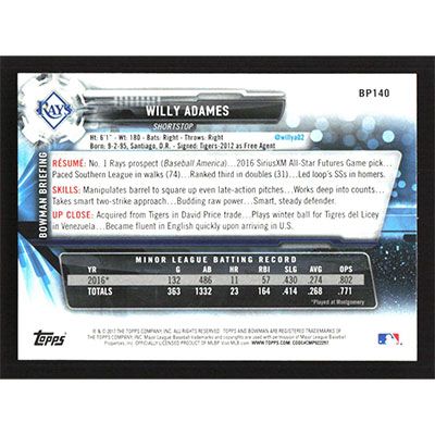 This is a 2017 Bowman Prospects Willy Adames autographed baseball card. This card has been signed, in blue, by Willy Adames, and is guaranteed authentic by Ballcardz.com. The card is #BP140 and pictures show condition.