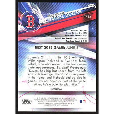 This is a 2017 Bowman's Best Top Prospects Purple Refractors Rafael Devers baseball card. The card is #TP-12 and pictures show condition. This card is limited; #'d 056/250.