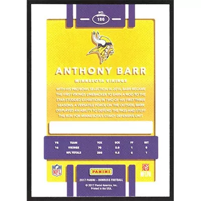 This is a 2017 Donruss Anthony Barr football card. The card is #186 and pictures show condition.