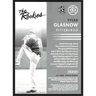 This is a 2017 Donruss The Rookies Tyler Glasnow baseball card. The card is #TR-6 and pictures show condition. Team(s): Pittsburgh Pirates Rookie Card (RC)