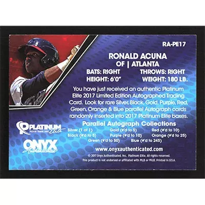This is a 2017 Onyx Platinum Elite Autographs Blue Ronald Acuña autographed baseball card. This card has been signed, in blue, by Ronald Acuña, and is certified authentic by Onyx Sports. The card is #RA-PE17 and pictures show condition. This card is limited; #'d /245.