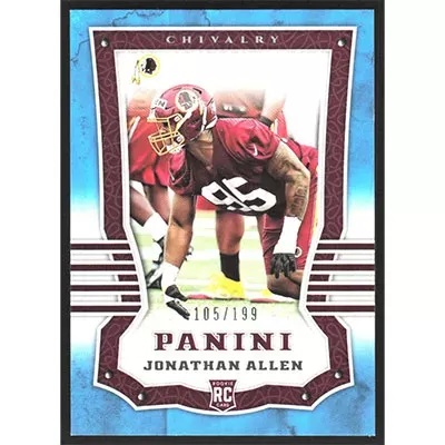 This is a 2017 Panini Chivalry Jonathan Allen football card. The card is #113 and pictures show condition. This card is limited; #'d 105/199. Team: Washington Redskins Rookie Card