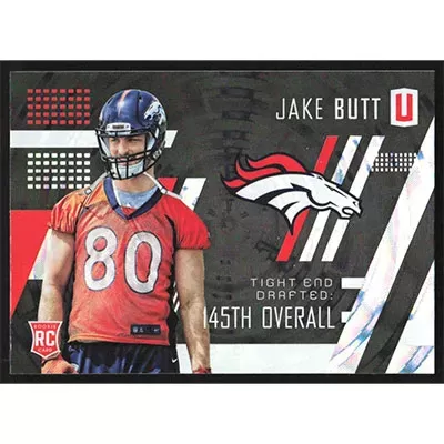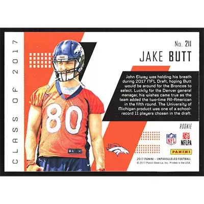This is a 2017 Panini Unparalleled Jake Butt football card. The card is #211 and pictures show condition.